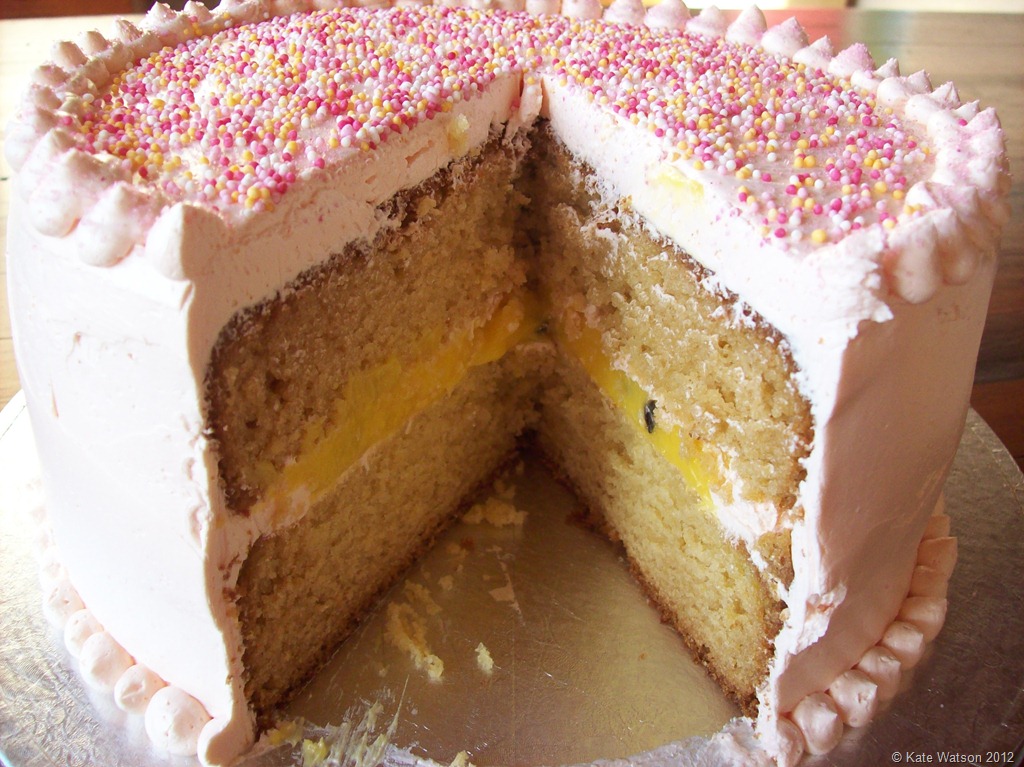 It’s a double layer vanilla cake, sandwiched with Lemon & Passionfruit Patisserie Filling from Barkers and generously coated in Swiss Meringue Buttercream.