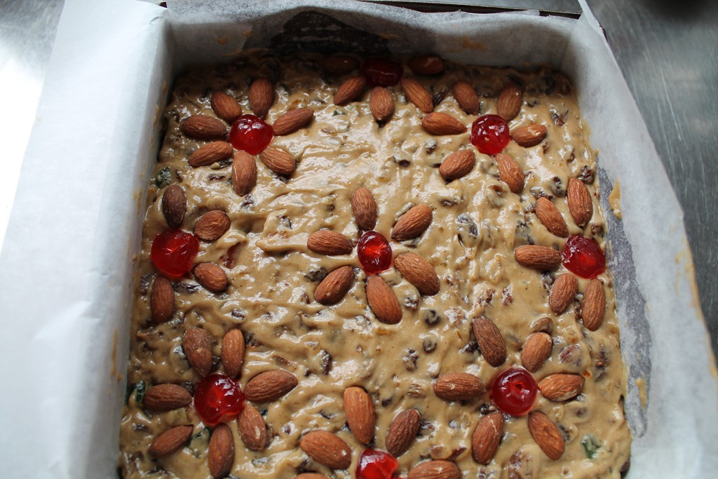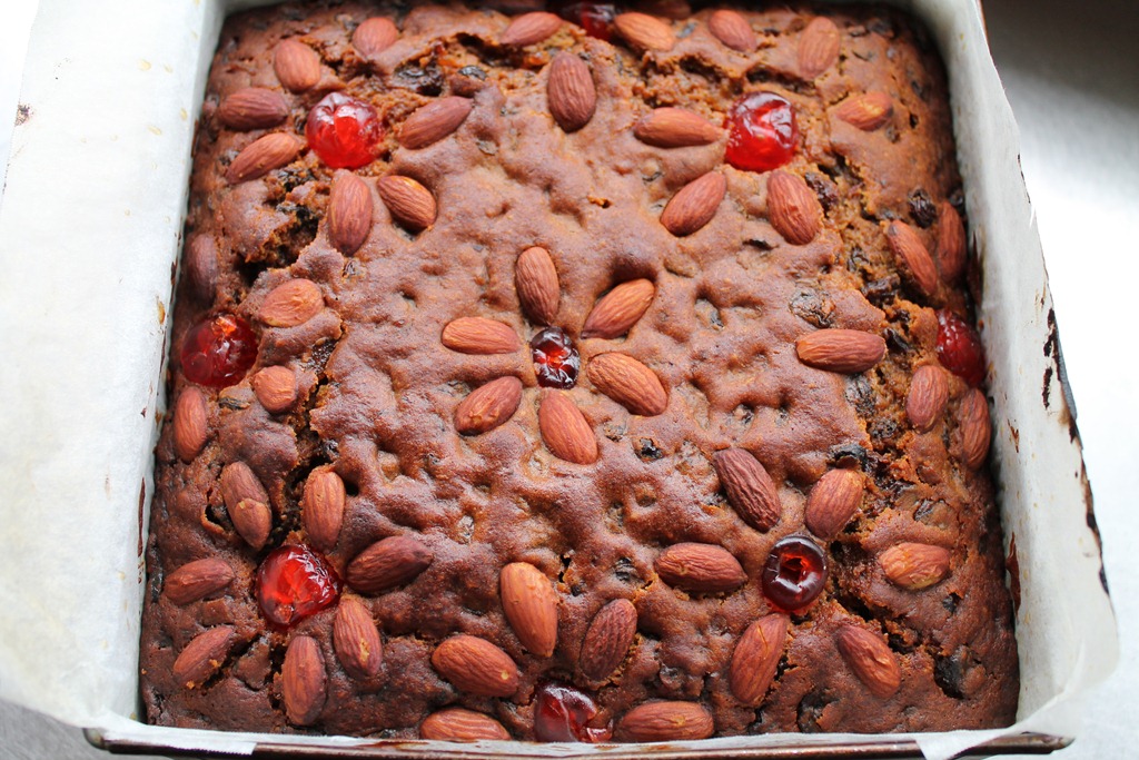 Decorate with cherries and almonds before baking if cake will be un-iced. Bake in a double lined 10” tin for half an hour at 180 C, then 3.5 hours at 120 C.