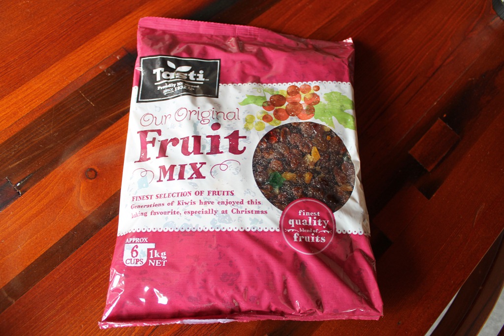 Just a few points about some of the ingredients. Firstly the mixed fruit. You can buy fruit mix especially for fruit cakes in the supermarket. It looks like this…