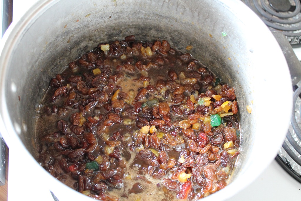 As far as the alcohol content is concerned, there are a few different variations you can use. I just used brandy to add to the pot after boiling the first lot of ingredients, but you could use sherry, or a mixture of the two. I actually made a second cake and used Cointreau in the mixture and sprinkled brandy over the cake when it came out of the oven.