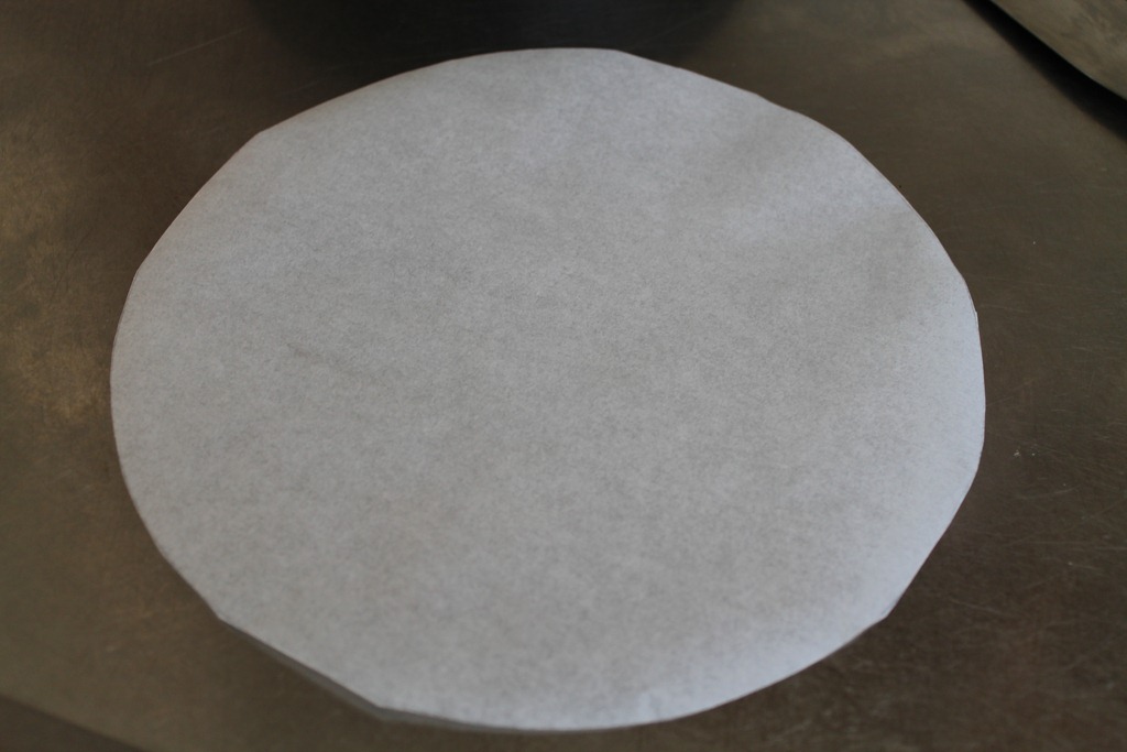 OK. Moving on. Place your tin on top of the baking paper and trace around with pencil, then cut out the circle. You don’t have to be super accurate so if you failed cutting and sticking in primary school there is hope for you yet. Now, you should have a circle roughly the size of your tin. Like this.