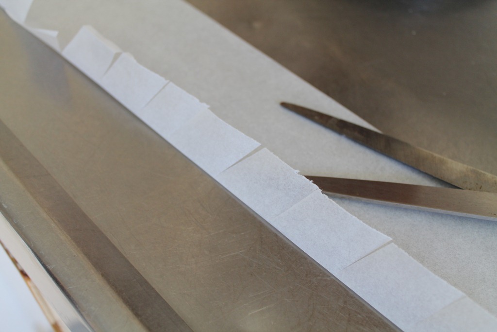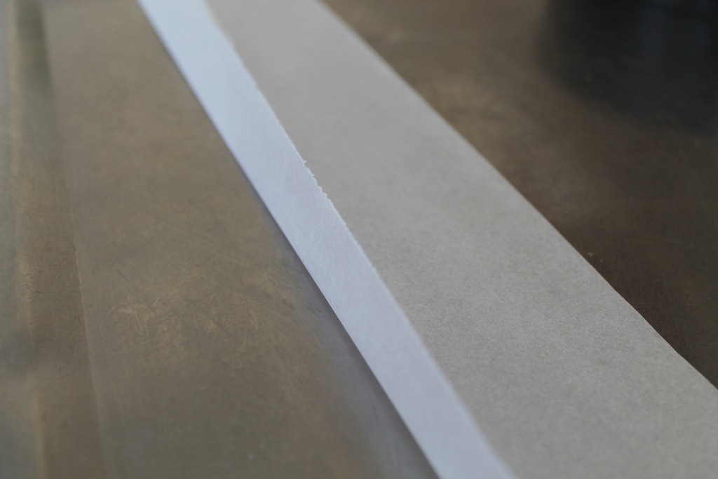 Then, we need a strip about 10cm wide. Because the standard width of baking paper seems to 30cm we fold the piece of baking paper lengthwise into thirds and cut – leaving us with three strips. We only need one, so you can save the other two for the next baking session.