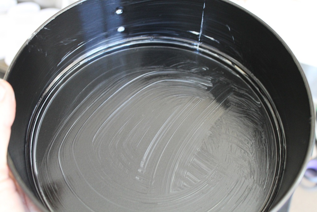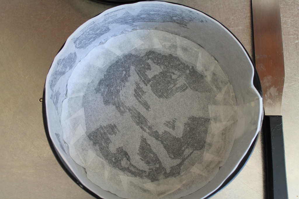 Next, place the circle of baking paper you cut earlier into the tin and smooth it down.