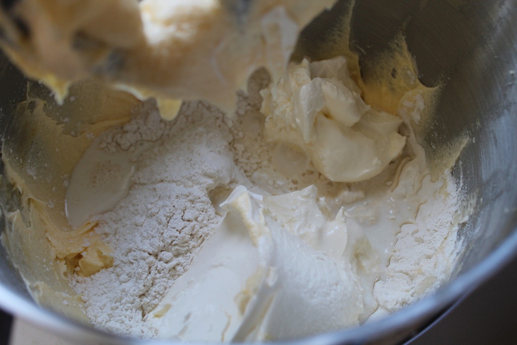 Then add remaining flour, coconut, sour cream and milk and mix until well combined.